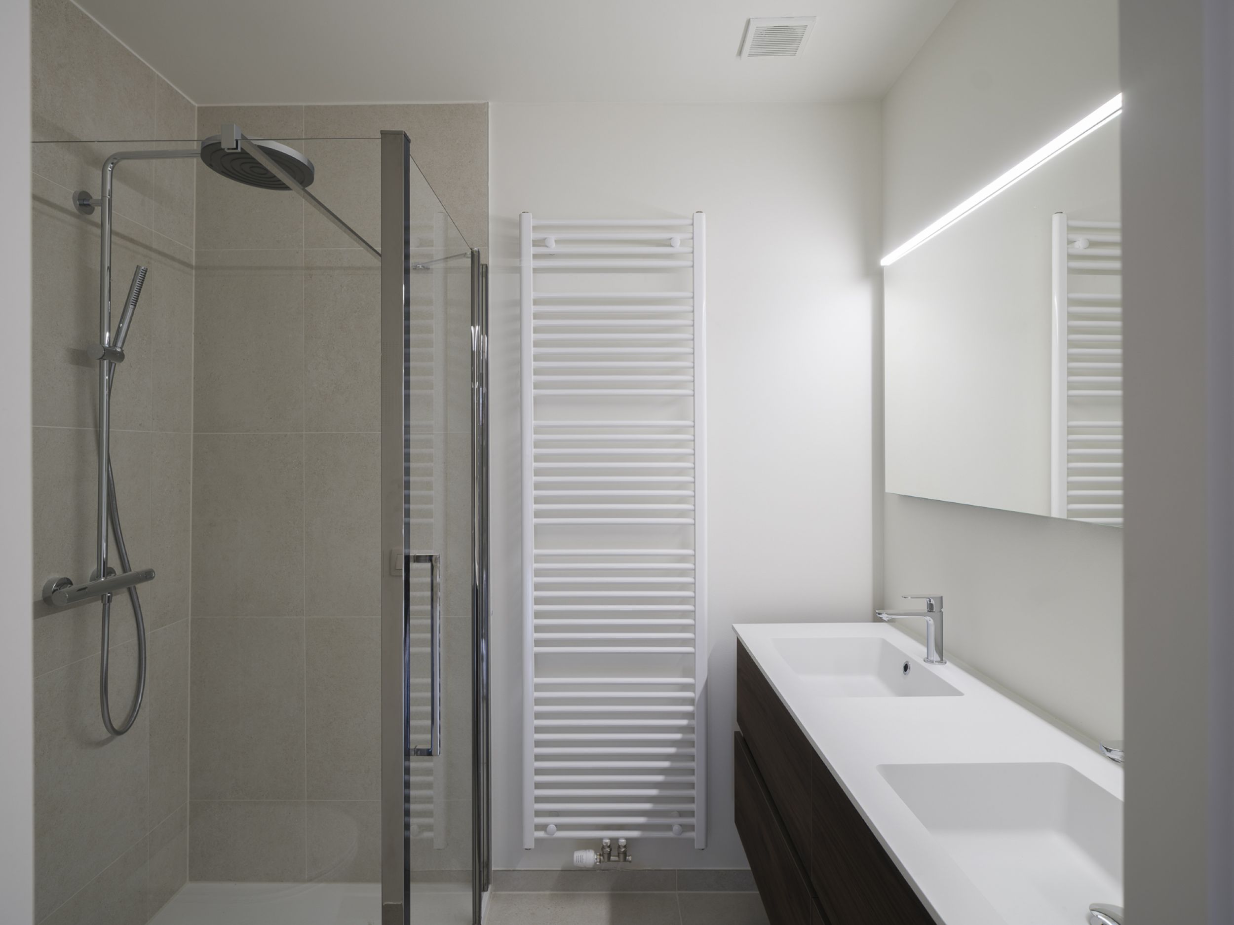 Binnenin werd bijzonder veel aandacht besteed aan kwaliteit en afwerking. De drie volwaardige slaapkamers zijn voorzien van stijlvolle parketvloeren en beschikken over grote raampartijen die voor heel wat lichtinval zorgen. De master bedroom heeft een ensuite badkamer uitgerust met een douche, toilet en dubbele wastafel. Daarnaast is er een tweede douchekamer met een ruime inloopdouche en een afzonderlijk gastentoilet.
